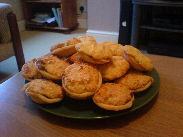The last two years we’ve done Christmas up here, so I’ve made my own, but this year we went to Mum’s so I didn’t get a chance to bake my own. My parents then followed us up to Brum, complete with a supply of pies which were finally finished last night so I haven’t had a chance to bake my own until today. They’re piping hot right now, so here’s a photo of the 2006 batch: